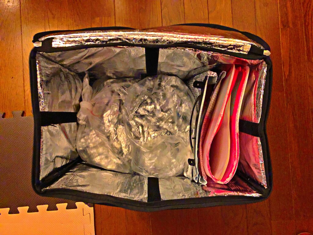 商品の保温・保冷を考えると商品をアルミシートで包んだ方が望ましいのですが、商品のピックアップのたびに包んでドロップオフのたびに開く運用では非常に手間がかかるので、アルミシートは緩衝材としてのみ使っています。