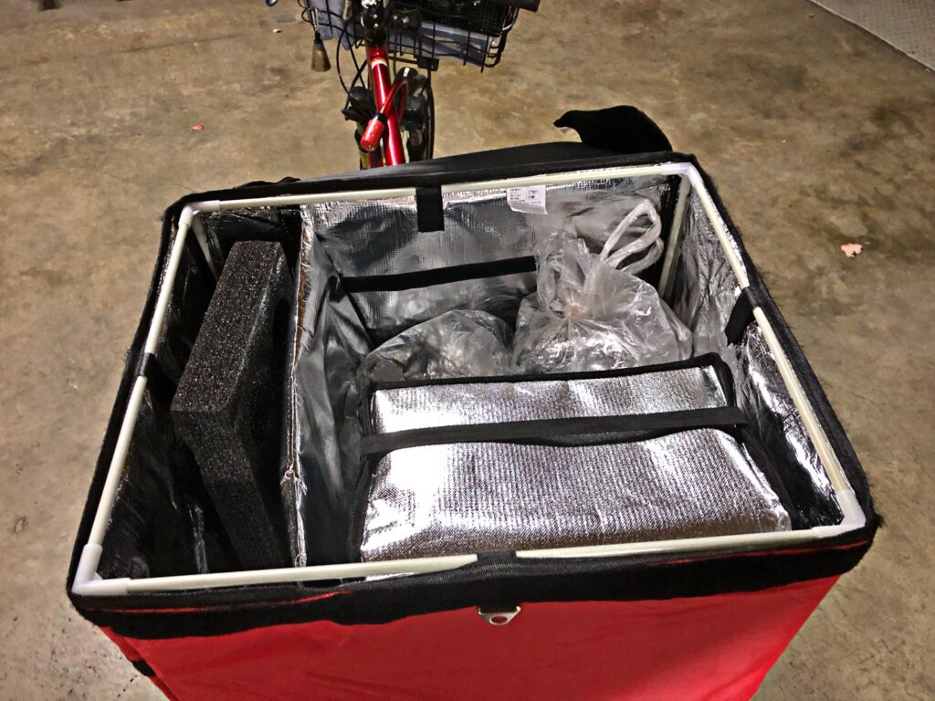商品の保温・保冷を考えると商品をアルミシートで包んだ方が望ましいのですが、商品のピックアップのたびに包んでドロップオフのたびに開く運用では非常に手間がかかるので、アルミシートは緩衝材としてのみ使っています。